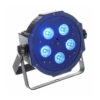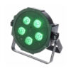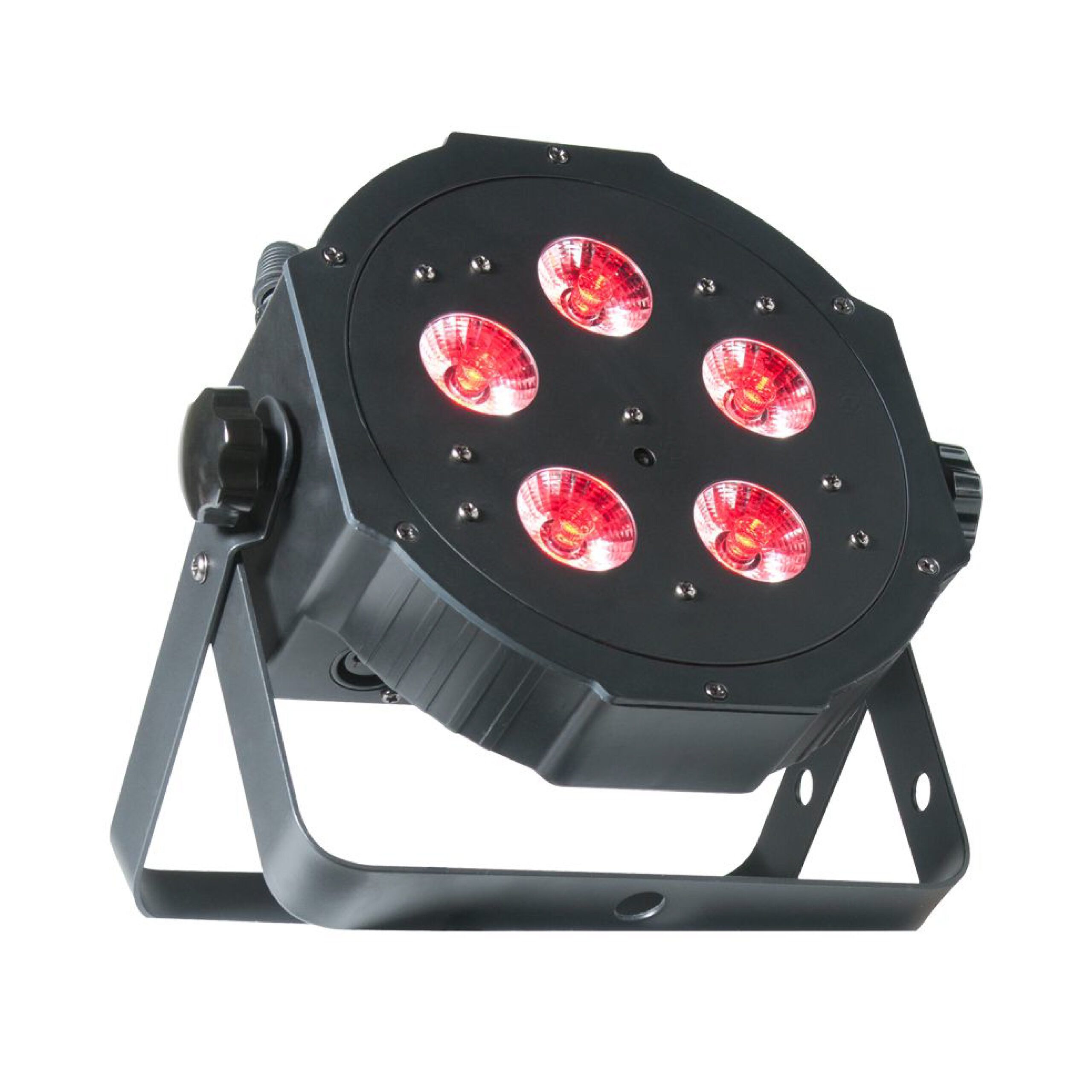 Im ADJ Mega TriPar Profile Plus leuchten fünf flickerfreie 4W-RGBUV-LEDs, wobei die gesamte Leistungsaufnahme bei 21W liegt. Mit 40° ist der Abstrahlwinkel weder extrem weit noch übermäßig eng. Zur Stromversorgung dieses und weiterer Spots findet man seitlich am Gehäuse je einen Ein- und Ausgang mit Kaltgerätebuchse. Ebenso sind in die lüfterlose Leuchte dreipolige XLR-In- und Outputs zum Betrieb mit einer separat erhältlichen DMX-Steuerung eingebaut, was auch schon auf eine der Bedienmöglichkeiten hindeutet. Der ADJ Mega TriPar Profile Plus kann wahlweise mit Menütasten und Display auf der Gehäuserückseite, per bereits genannter DMX-Steuerung auf vier bis zehn Kanälen oder mit einer optionalen Funk-Fernbedienung gestartet werden.