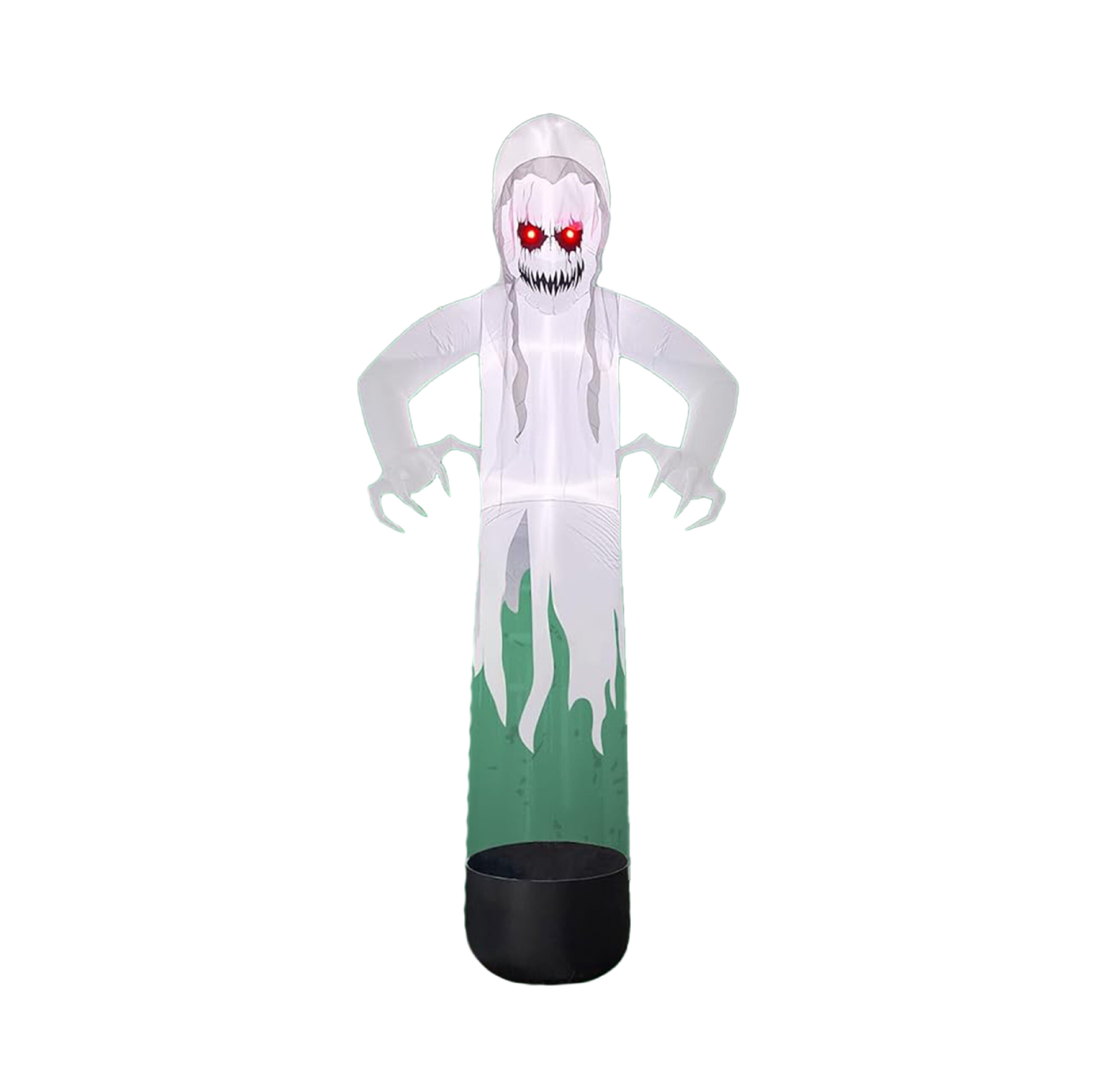 Diese Halloween Figur ist aufgeblasen etwa 3,59 m hoch und kann so auch aus der Ferne gesehen werden kann. Eingebaute LED-Leuchten verbessern den Betrachtungseffekt nachts, um eine bezaubernde Nachtausstellung zu erstellen. Der mittlere Teil dieses aufblasbaren Geistes ist transparent und scheint, als würde ein Geist in der Luft hängen.