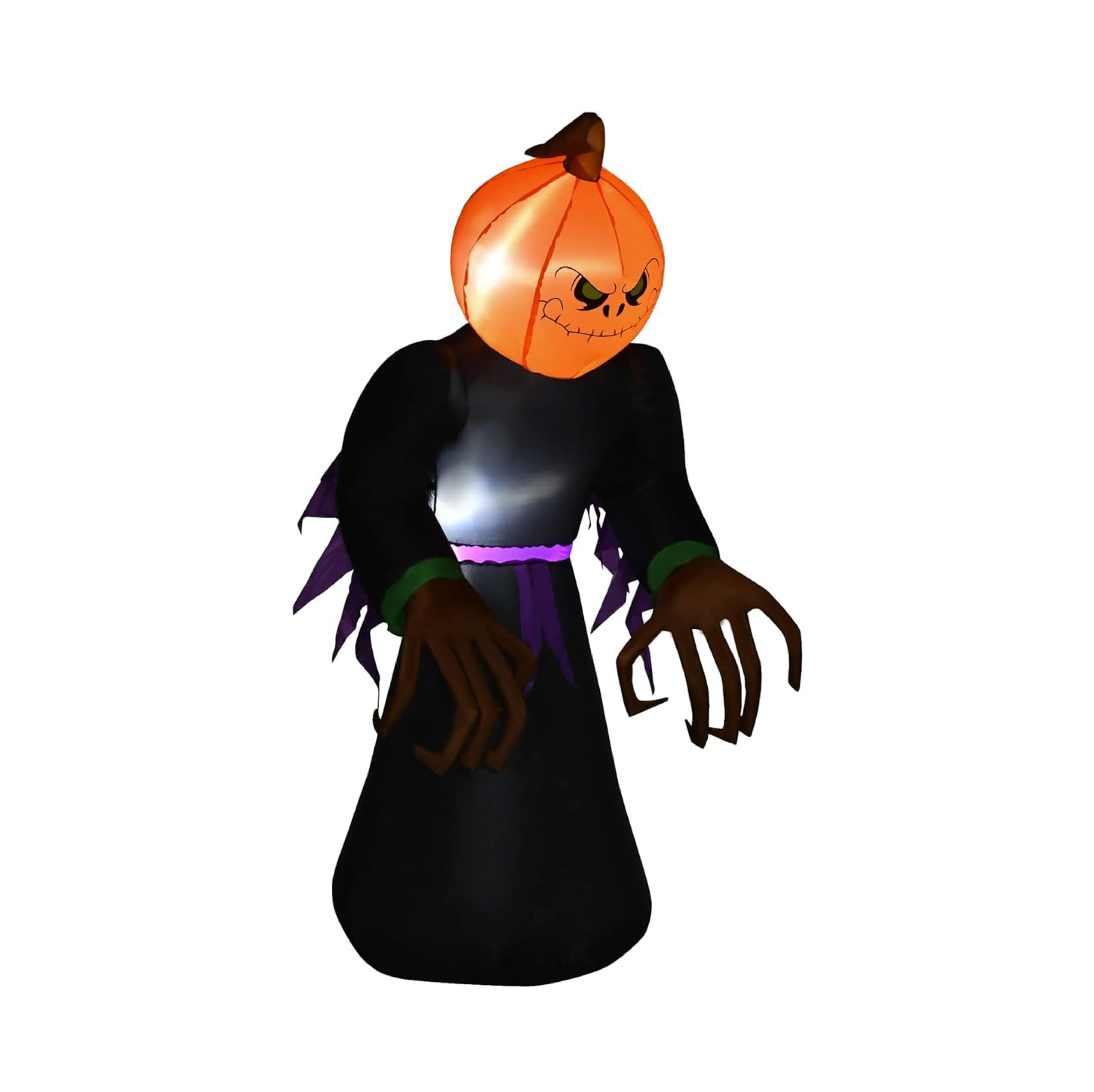 Unser aufblasbares Schreckgespenst mit Kürbiskopf ist die perfekte Begrüßung für Ihre Halloweenparty. Gruselig beleuchtet weist er Ihren Gästen den Weg. Dank integrierter LEDs erleuchtet Ihre Halloweendeko auch an dunklen Nächten schaurig schön. Einmal ans Stromnetz angeschlossen, bläst sich Ihr Spukgespenst in wenigen Minuten von selbst auf. Ist die Luft abgelassen, lässt es sich zudem platzsparend zusammenfalten. Gefertigt wird Ihr Schreckgespenst aus strapazierfähigem Polyestergewebe. Dank IP44-Klassifizierung eignet es sich ideal für den Einsatz im Innen- und geschützten Außenbereich. Hinweis: Die Hülle ist leicht luftdurchlässig, sodass die Figur nur bei laufender Pumpe ihre Form behält. Die Pumpe ist für den Dauerbetrieb ausgelegt.