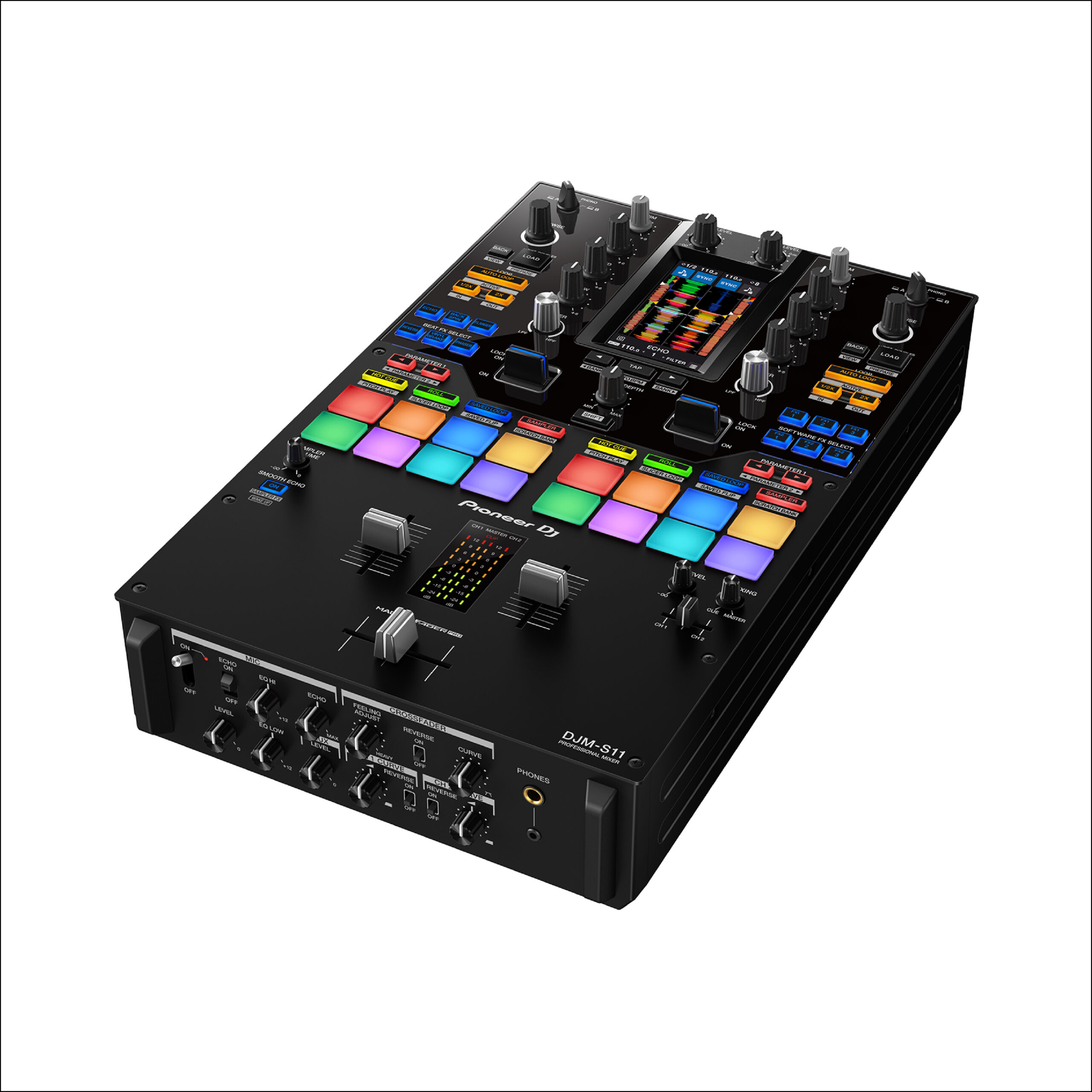Wachse über dich hinaus − mit dem 2-Kanal-DJ-Scratching-Mixer DJM-S11. Dieser neue professionelle 2-Kanal-Battle-Mixer mit 4 Decks wartet gegenüber seinem Vorgänger DJM-S9 mit einigen Verbesserungen auf und bietet eine Reihe brandneuer Funktionen, mit denen du noch freier mit Serato DJ Pro oder rekordbox performen kannst.