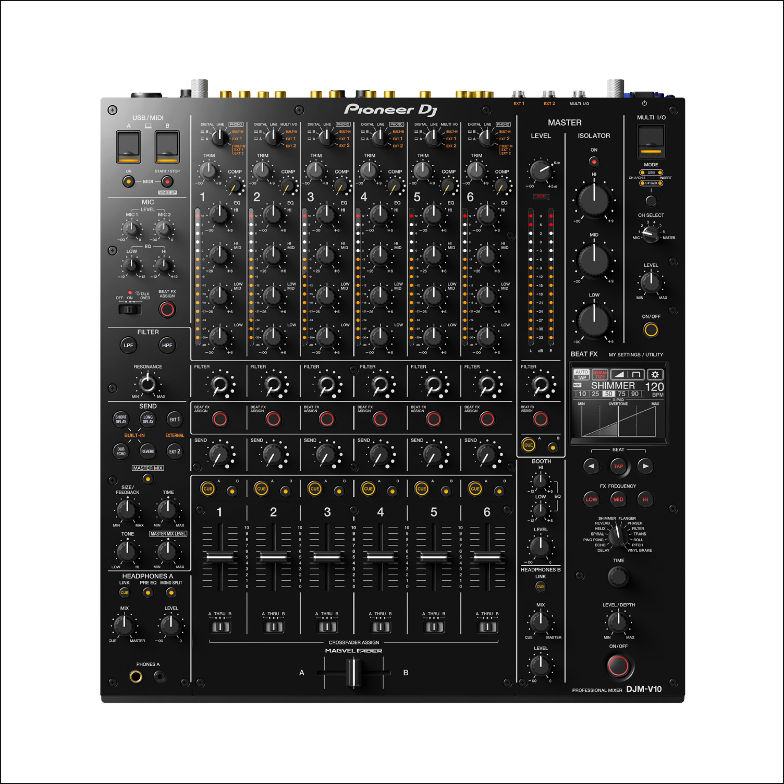 Schmiede mit dem 6-Kanal-Profi-DJ-Mixer DJM-V10 einen völlig neuen Sound. Der DJM-V10 ist eine neue Art von Mixer – geboren aus neuem, frischem Denken. Er wurde entwickelt, damit kreative DJs ihre ganz eigenen Klangwelten erschaffen können. Dieser 6-Kanal-Mixer überzeugt mit einer ganzen Reihe einzigartiger Funktionen – und mit seinem warmen Klang voller Energie und Präsenz. Übernimm die volle Kontrolle über deinen Mix und erschaffe etwas, das das Publikum noch nie zuvor gehört hat.
