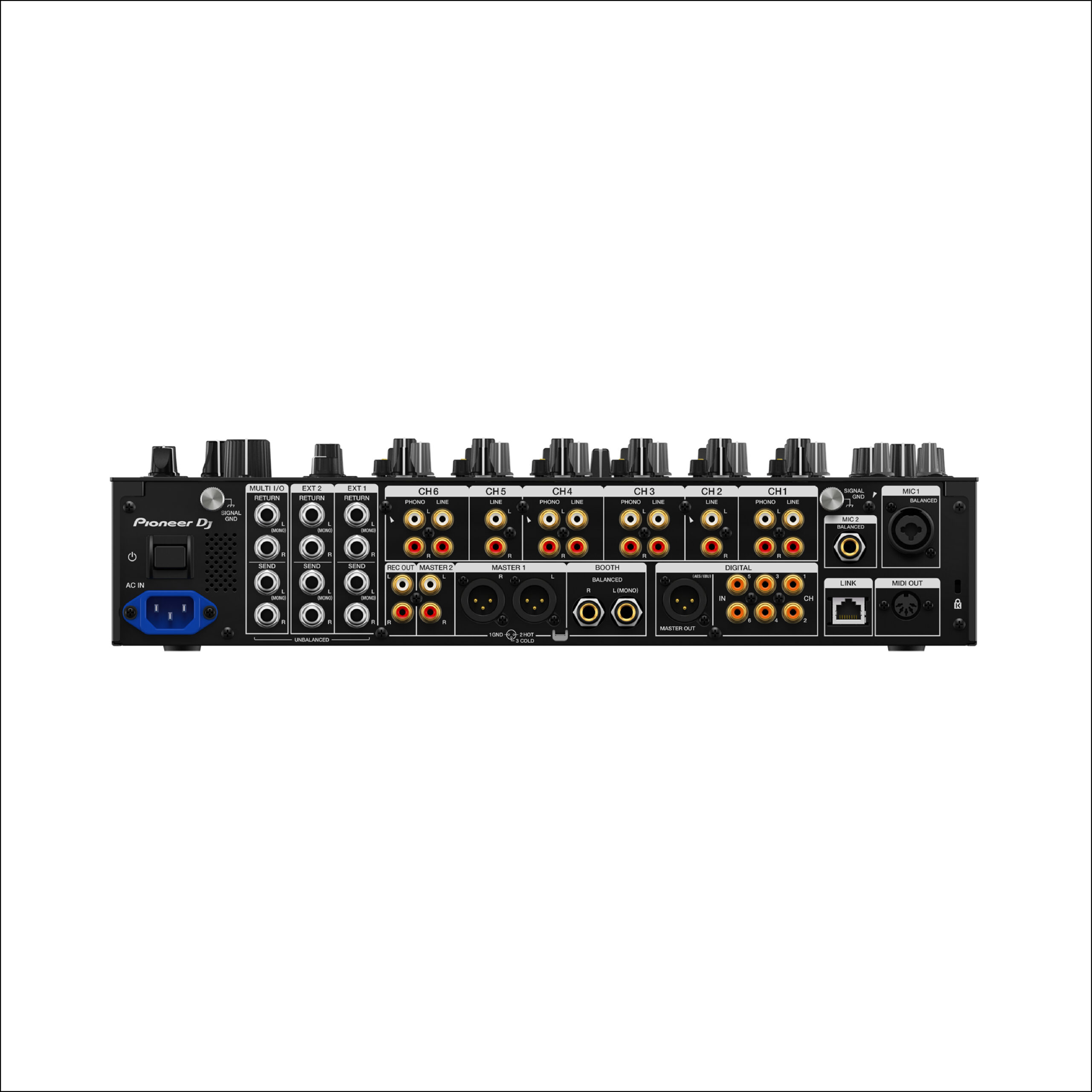 - Ausgänge: 2x MASTER (XLR, Cinch), 1x BOOTH (6,3 mm Klinke), 4x KOPFHÖRER-MONITOR (6,3 mm Klinke, Miniklinke), 1x REC (Cinch), 1x DIGITAL (AES/EBU), 1x MIDI (DIN)